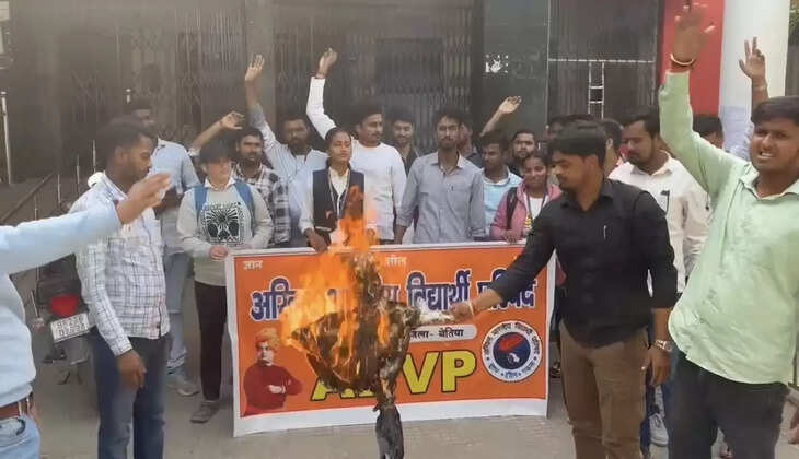 Bihar news: पश्चिम चम्पारण के बेतिया स्थित एमजेके कॉलेज परिसर में आज पीजी परीक्षा केंद्र को लेकर छात्रों का आक्रोश फूट पड़ा। पीजी सत्र 2022–24 के द्वितीय सेमेस्टर की परीक्षा का केंद्र मुजफ्फरपुर बनाए जाने के विरोध में ABVP के दर्जनों कार्यकर्ताओं और छात्रों ने विश्वविद्यालय प्रशासन का पुतला दहन किया और जमकर विरोध प्रदर्शन किया।