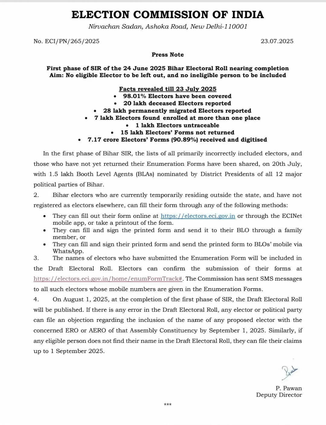 भारत निर्वाचन आयोग ने सूचित किया है कि 24 जून 2025 से शुरू हुई बिहार राज्य की मतदाता सूची के पहले चरण की विशेष पुनरीक्षण प्रक्रिया (SIR) अब अपने अंतिम चरण में पहुंच चुकी है। इस व्यापक अभियान का मूल उद्देश्य यह सुनिश्चित करना है कि हर पात्र नागरिक का नाम सूची में दर्ज हो और कोई भी अपात्र व्यक्ति उसमें शामिल न रहे।