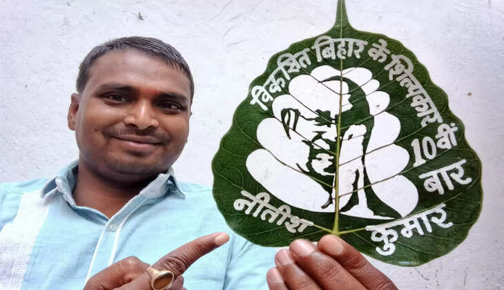 अंतरराष्ट्रीय ख्याति प्राप्त लीफ-आर्टिस्ट मधुरेंद्र ने पीपल के पत्ते पर बेहद बारीकी से मुख्यमंत्री नीतीश कुमार का चित्र उकेरा, जिसे देखने वाले दंग रह जा रहे हैं। पत्ते पर उन्होंने बड़ा और प्रभावशाली संदेश भी लिखा है- “विकसित बिहार के शिल्पकार- 10वीं बार नीतीश कुमार”