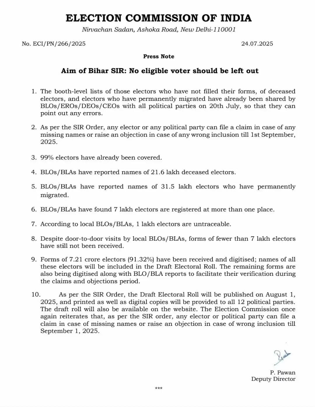 अब तक 91.32% यानी 7.21 करोड़ मतदाता फॉर्म प्राप्त कर उन्हें डिजिटलीकृत कर लिया गया है। इन नामों को प्रारंभिक मतदाता सूची में शामिल किया जाएगा। शेष फॉर्मों की जाँच और डिजिटल एंट्री प्रक्रिया अंतिम चरण में है।