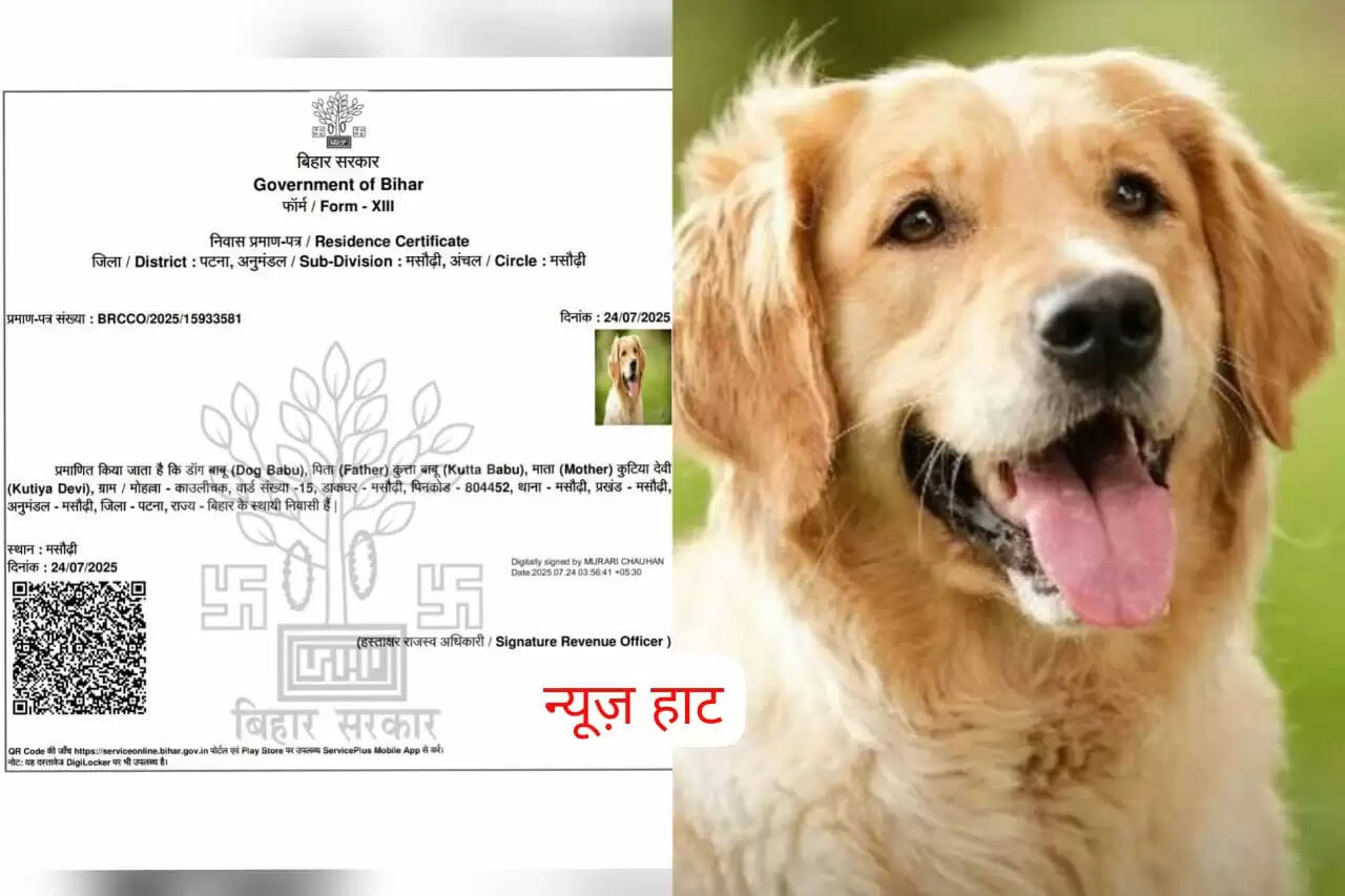 पटना से सटे मसौढ़ी में एक चौंकाने वाला मामला सामने आया है, जहां एक कुत्ते के नाम पर आवासीय प्रमाण पत्र जारी कर दिया गया। इस प्रमाण पत्र पर नाम "डॉग बाबू", पिता का नाम "कुत्ता बाबू" और माता का नाम "कुटिया देवी" लिखा हुआ है। यह प्रमाण पत्र मसौढ़ी अंचल कार्यालय के RTPS पोर्टल से जारी किया गया था और इसमें राजस्व पदाधिकारी मुरारी चौहान की डिजिटल सिग्नेचर भी मौजूद है।