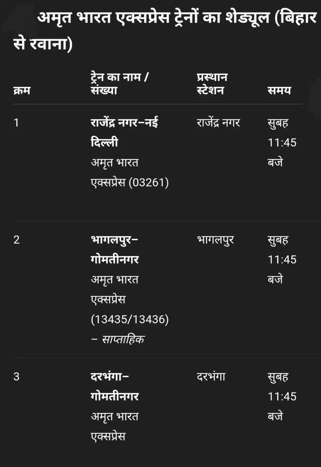 पीएम मोदी कल यानी शुक्रवार को बिहार को चार अमृत भारत ट्रेनों की सौगात देंगे। नीचे ट्रैन ने जुड़े समय को लेकर एक टेबल बनाया गया है: