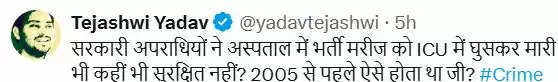 नेता प्रतिपक्ष तेजस्वी यादव ने भी पोस्ट करते हुए लिखा- ''सरकारी अपराधियों ने अस्पताल में भर्ती मरीज को ICU में घुसकर मारी गोली। बिहार में कोई भी कहीं भी सुरक्षित नहीं? 2005 से पहले ऐसे होता था जी?''