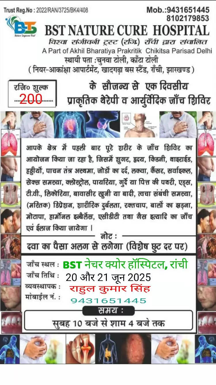 राजधानी रांची के कांटाटोली के चुनवा टोली स्थित BST नेचर क्योर हॉस्पिटल में 20 एवं 21 जून 2025 (शुक्रवार और शनिवार) को दो दिवसीय स्वास्थ्य शिविर का आयोजन किया जा रहा है। इस शिविर में आने वाले सभी व्यक्तियों की संपूर्ण शारीरिक जांच की जाएगी। पंजीकरण शुल्क के लिए ₹200 पंजीकरण राशि तय की गयी है, साथ ही उपचार हेतु दी जाने वाली दवाओं का मूल्य वहन करना होगा।