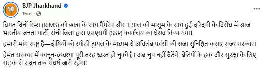 Ranchi: यह मामला रांची (झारखंड), भारत से है जहाँ RIMS की डेंटल छात्रा के साथ गैंगरेप की घटना को लेकर राजनीतिक और सामाजिक तनाव बढ़ गया है. रिम्स डेंटल छात्रा सामूहिक दुष्कर्म मामले में महानगर भाजपा ने सोमवार को एसएसपी कार्यालय का घेराव किया. प्रदर्शनकारियों ने जयपाल सिंह मुंडा स्टेडियम से जुलूस निकाला और एसएसपी कार्यालय पहुंचकर जमकर नारेबाजी की. इस दौरान पुलिस द्वारा मुख्य गेट बंद किए जाने से आक्रोशित महिलाओं ने उसे तोड़ने का प्रयास किया.
