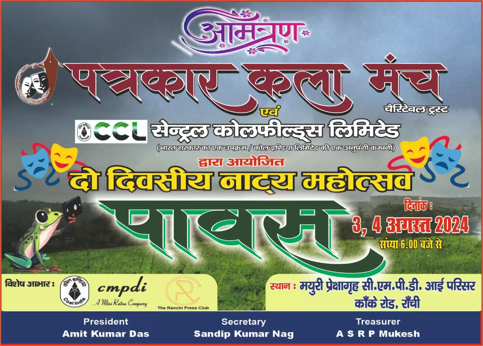 पत्रकार कला मंच और सीसीएल के संयुक्त तत्वाधान में दो दिवसीय नाट्य महोत्सव ’पावस’ का शुभारंभ सीएमपीडीआई के मयूरी प्रेक्षागृह में शाम के 6 बजे होना है। तीन और चार अगस्त को होने वाले इस नाट्य महोत्सव में पहले दिन नाट्यालय के द्वारा भगवदजुक्कम की प्रस्तुति होगी जिसका निर्देशन सुकंठ ठाकुर करेंगे। इसके बाद झारखंड फिल्म और थिएटर अकादमी के द्वारा गिरगिट की प्रस्तुति होगी जिसका निर्देशन राजीव सिन्हा ने किया है। महोत्सव के दूसरे दिन 4 अगस्त को पत्रकार कला मंच की प्रस्तुति सैंया भए कोतवाल होगी, जिसका निर्देशन संतोष मृदुला ने और संगीत निर्देशन निलय सिंह ने किया है। पत्रकार कला मंच के अध्यक्ष अमित दास ने सभी नाट्य प्रेमियों से इसमें आने और कलाकारों के उत्साह वर्धन का अनुरोध किया है, उन्होंने बताया कि ये महोत्सव थैलेसीमिया से प्रभावित बच्चों के सहायतार्थ किया जा रहा है। महोत्सव में प्रवेश निशुल्क है।