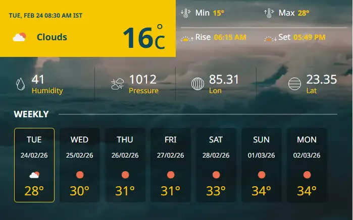 रांची के मौसम (Ranchi Weather) की बात करें तो आज 24/02/2026 को तापमान 16 डिग्री दर्ज किया गया. अधिकतम तापमान 28 डिग्री और न्यूनतम तापमान 15 डिग्री के आसपास रहने का अनुमान है. सूर्योदय का वक्त 06:15 AM बजे है, जबकि सूर्यास्त शाम 05:49 PM बजे होगा. नमी का स्तर 41 % है, वहीं वायुमंडलीय दबाव 1012 के स्तर पर है.