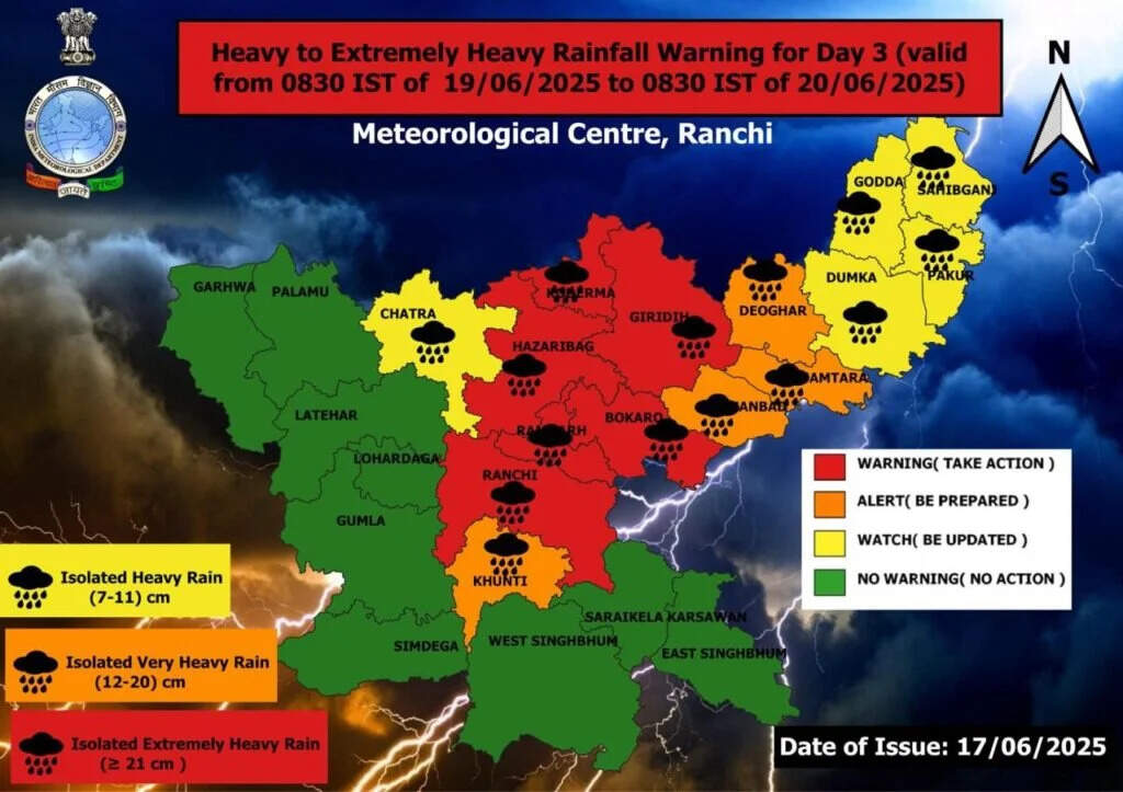 मौसम विभाग के अनुसार, 19 और 20 जून को रांची, रामगढ़, हजारीबाग, बोकारो, कोडरमा और गिरिडीह में रेड अलर्ट जारी किया गया है। इसके अलावा खूंटी, धनबाद, जामताड़ा और देवघर में भी भारी वर्षा की आशंका जताई गई है। वहीं चतरा, दुमका, गोड्डा, पाकुड़ और साहिबगंज जिलों के लिए येलो अलर्ट जारी किया गया है। सिंहभूम और पलामू के लिए किसी तरह की चेतावनी फिलहाल नहीं दी गई है।