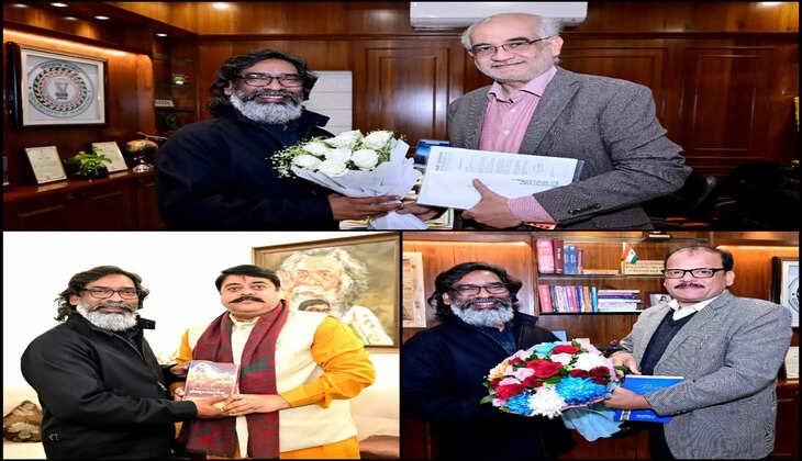 आज रांची स्थित मुख्यमंत्री आवासीय कार्यालय, कांके रोड में मुख्यमंत्री हेमन्त सोरेन से बी.आई.टी. मेसरा के कुलपति डॉ. इंद्रनील मन्ना, झारखंड राज्य गौ सेवा आयोग के अध्यक्ष राजीव रंजन प्रसाद और झारखंड लोक सेवा आयोग (जे.पी.एस.सी.) के सदस्य डॉ. जमाल अहमद ने मुलाकात की। इस दौरान उन्होंने मुख्यमंत्री को नववर्ष 2025 की हार्दिक बधाई और शुभकामनाएं दीं। मुख्यमंत्री हेमन्त सोरेन ने भी उन्हें नूतन वर्ष की बधाई दी और उनके जीवन में सुख-समृद्धि की कामना की।