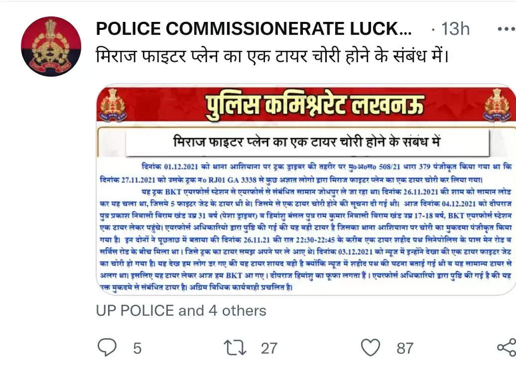 वहीं दूसरी तरफ इस मामले को लेकर पुलिस ने कहा कि, बीकेटी एयरफोर्स स्टेशन पर लड़ाकू विमान मिराज के टायर को दो युवकों ने वायु सेना के अधिकारियों को सौंप दिया. चोरों ने ये टायर शहीद पथ के किनारे से चोरी किया था. इस मामले में 1 दिसंबर को केस दर्ज किया गया था.