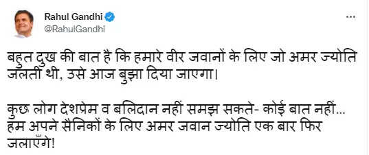 राहुल गांधी ने ट्वीट करते हुए लिखा कि बहुत दुख की बात है कि हमारे वीर जवानों के लिए जो अमर ज्योति जलती थी, उसे आज बुझा दिया जाएगा. कुछ लोग देशप्रेम व बलिदान नहीं समझ सकते- कोई बात नहीं… हम अपने सैनिकों के लिए अमर जवान ज्योति एक बार फिर जलाएंगे.