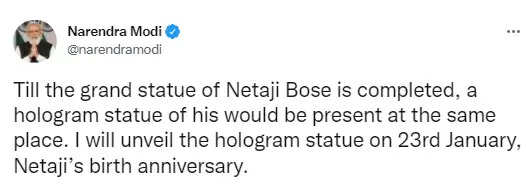 आपको बता दे कि प्रधानमंत्री मोदी ने ट्वीट करते हुए कहा कि ऐसे समय में जब पूरा देश नेताजी सुभाष चंद्र बोस की 125वीं जयंती मना रहा है, मुझे यह बताते हुए खुशी हो रही है कि नेताजी की ग्रेनाइट से बनी भव्य प्रतिमा इंडिया गेट पर स्थापित की जाएगी. यह उनके प्रति भारत की कृतज्ञता का प्रतीक होगा.