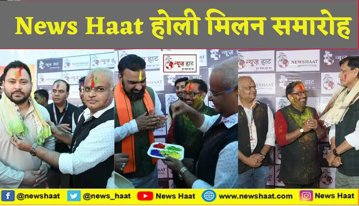 पटना के बांकीपुर क्लब में शुक्रवार 7 मार्च को NEWS HAAT द्वारा होली मिलन समारोह का आयोजन किया गया. जिसमें राजनीति, व्यापार और अन्य क्षेत्रों से जुड़े कई गणमान्य शामिल हुए. सभी ने एक-दूसरे को रंग लगाकर होली की अग्रिम शुभकामनाएं दी और मिठाईयां भी खिलाईं. NEWS HAAT के डायरेक्ट अमित अग्रवाल, राकेश कुमार और मैनेजिंग एडिटर कन्हैया भेलारी ने सभी अतिथियों को अंगवस्त्र देकर और रंग लगाकर स्वागत किया. कार्यक्रम में गायकों ने होली के गानों से ऐसा समा बांधा की सभी झूम उठे. बिहार के नेता प्रतिपक्ष तेजस्वी यादव जब कार्यक्रम में पहुंचे तो खुद को गाने से रोक नहीं पाए. उन्होंने गायकों के साथ सुर में सुर मिलते हुए 'बाबा हरिहर नाथ सोनपुर में होली खेले' गाया.