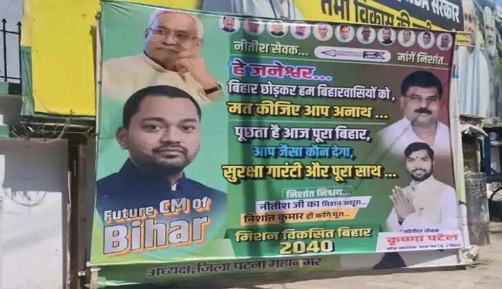 पटना में जदयू कार्यकर्ताओं द्वारा लगाए गए पोस्टरों ने नया विवाद खड़ा कर दिया है। इन पोस्टरों में निशांत कुमार को ‘फ्यूचर मुख्यमंत्री’ बताया गया है, साथ ही नारे लिखे गए हैं- “नीतीश सेवक मांगे निशांत… बिहार पूछता है, कौन देगा सुरक्षा की गारंटी?”