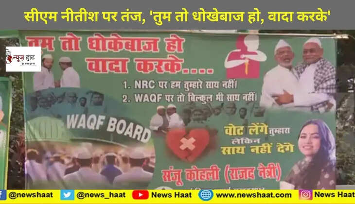 पोस्टर पर मुख्यमंत्री की तस्वीर के साथ लिखा, 'तुम तो धोखेबाज हो, वादा करके....। NRC पर हम तुम्हारे साथ नहीं। WAQF पर तो बिल्कुल भी साथ नहीं। वोट लेंगे तुम्हारा लेकिन साथ नहीं देंगे।' पोस्टर आरजेडी नेता और जहानाबाद मखदुमपुर से पूर्व जिला पार्षद संजू कोहली की ओर से लगाया है।